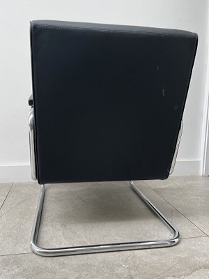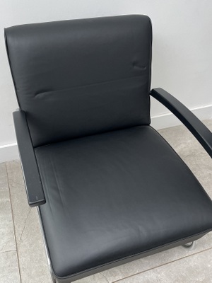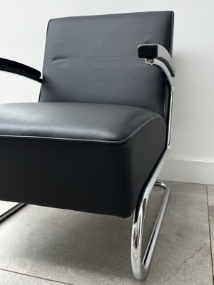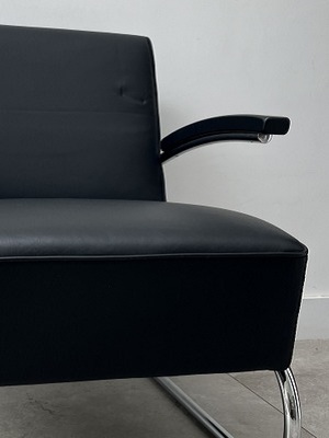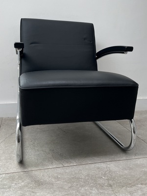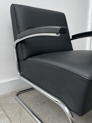 Originally designed in 1932 by Willem Gispen for Thonet.Cantilever chair with chrome frame and matt black leather upholstery.The chair is in very good condition showing only light signs of age including a few indentations to the leather on the back rest (see photos).Dimensions (cm):height: 79seat height: 40width: 63depth: 79